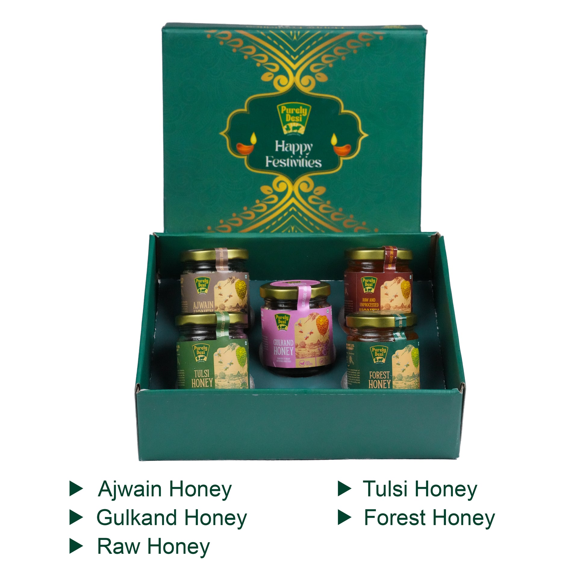 Celebrate health, sweetness, and togetherness with the Purely Desi Festive Gift Box, thoughtfully curated with five premium honey variants: Tulsi, Raw, Gulkand, Ajwain, and Forest Honey. Each jar is packed with natural goodness, combining the health benefits of honey with unique flavors that delight the taste buds.